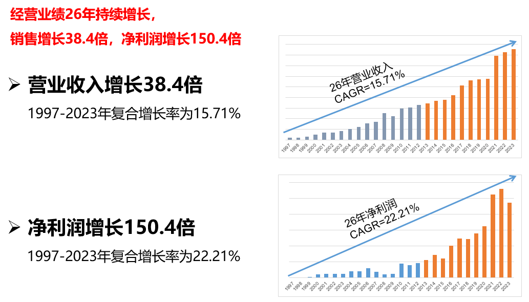 成立26年來,公司銷售增長38.4倍,凈利潤增長150.4倍,凈利潤年復合增長達22.21%