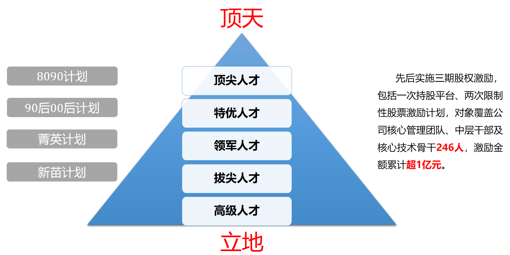 實施面向中高層團隊的8090計劃,面向年輕人才的菁英計劃、新苗計劃,面向骨干的股權激勵計劃,并建立起學習型員工賦能體系。