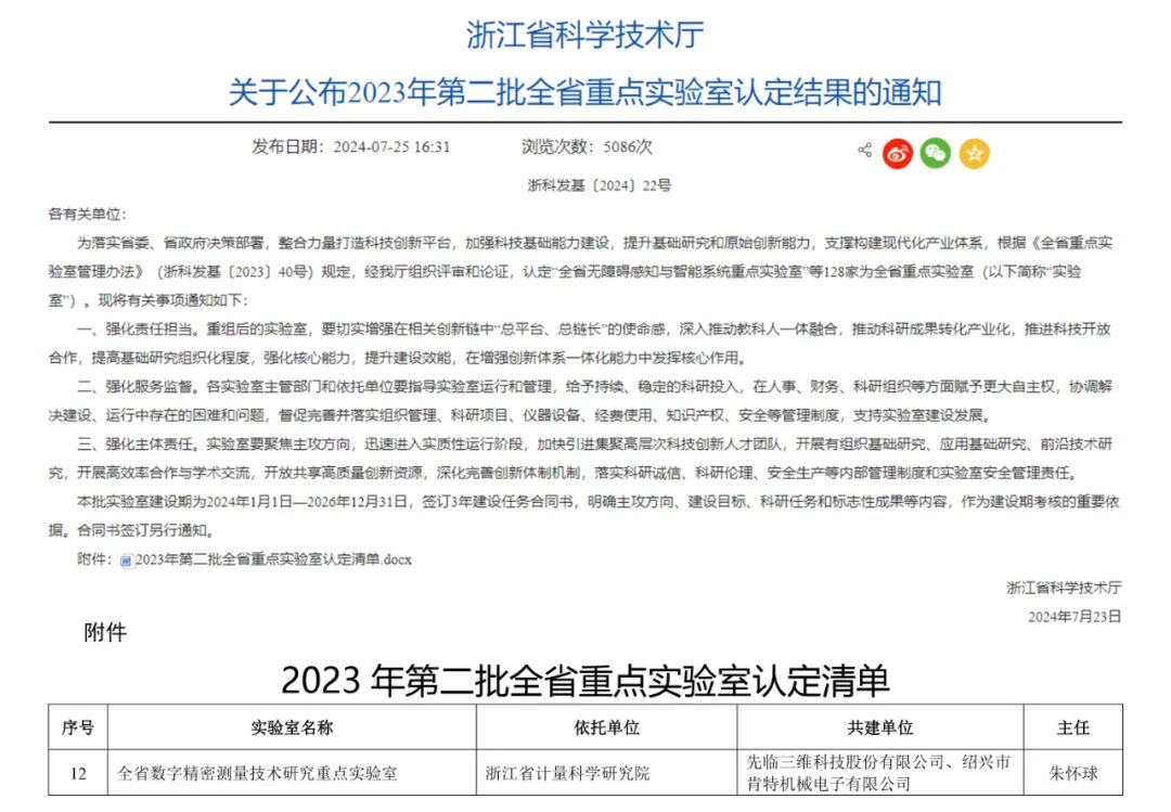 近日,由浙江省質(zhì)量科學(xué)研究院牽頭,先臨三維科技股份有限公司參與共建的“全省數(shù)字精密測量技術(shù)研究重點(diǎn)實(shí)驗(yàn)室”被浙江省科學(xué)技術(shù)廳認(rèn)定為浙江省2023年第二批全省重點(diǎn)實(shí)驗(yàn)室。