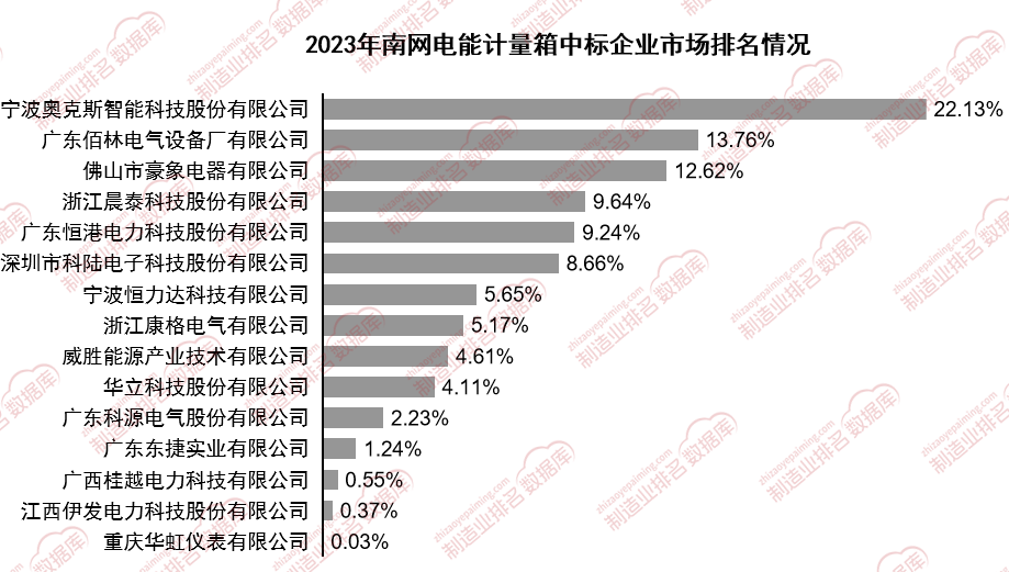 2023年度,南網范圍內電能計量箱產品的招標市場總體規(guī)模約為5.4億元,共有15家企業(yè)中標。在這些企業(yè)中,寧波奧克斯智能科技股份有限公司中標金額最大,約為1.2億元元,占比約22.1%。其次,是廣東佰林電氣設備廠有限公司和佛山市豪象電器有限公司,中標金額分別為74.6百萬元和68.4百萬元,占比分別為13.8%和12.6%。整體來看,南網電能計量箱產品市場的供應商整體較為集中。