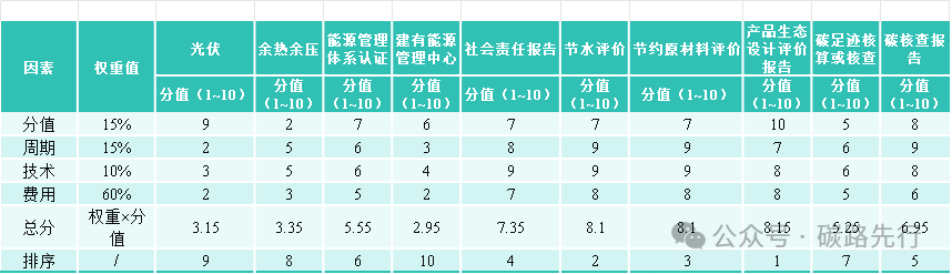 根據以上的拉分項,我們將從這些項目在申報綠色工廠時所占的分值,實施的周期,實施的難易程度,實施的費用進行權重分析打分,來對申報綠色工廠時必要的補足材料進行一個綜合性的排序。