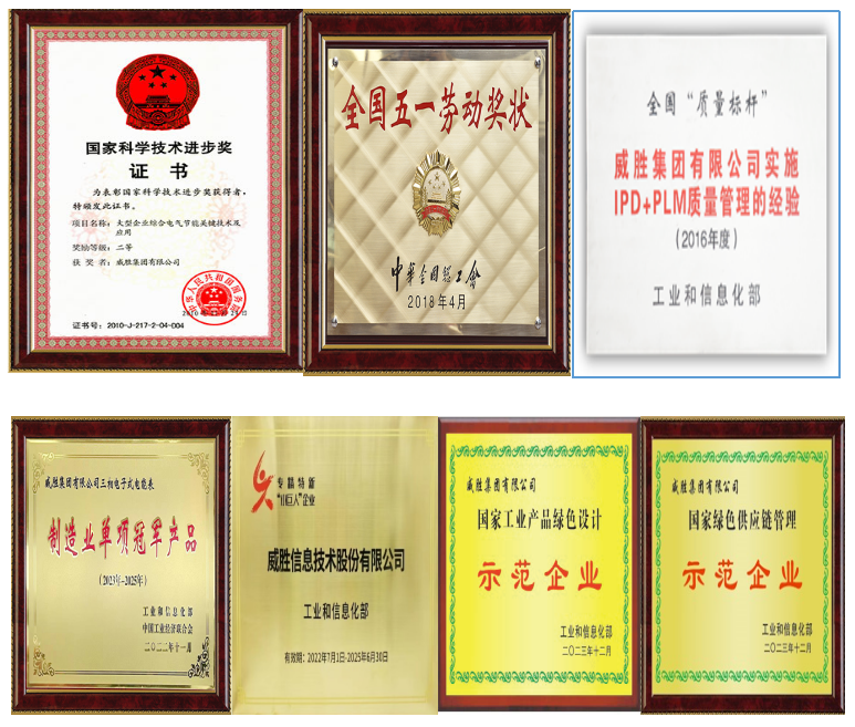威勝榮獲國(guó)家級(jí)科技進(jìn)步二等獎(jiǎng) 1 項(xiàng),中國(guó)專利優(yōu)秀獎(jiǎng) 1 項(xiàng),其他省、市級(jí)科技獎(jiǎng)多項(xiàng)。2016 年威勝榮獲國(guó)家工信部“2016 年智能制造試點(diǎn)示范項(xiàng)目”、全國(guó)“質(zhì)量標(biāo)桿企業(yè) ”稱號(hào),2017 年榮獲第五屆湖南省省長(zhǎng)質(zhì)量獎(jiǎng),2018 先后榮獲“全國(guó)五一勞動(dòng)獎(jiǎng)狀 ”與“ 中國(guó)企業(yè)文化建設(shè)先進(jìn)單位 ”。2019 年三相電子式電能表成功入選工信部第四批制造業(yè)單項(xiàng)冠軍產(chǎn)品,2021 年榮獲國(guó)家工信部頒發(fā)的“工業(yè)互聯(lián)網(wǎng)試點(diǎn)示范項(xiàng)目”和“智能光伏試點(diǎn)示范企業(yè)” ,2022 年榮獲國(guó)家級(jí)專精特新“小巨人”企業(yè)和中國(guó)電工技術(shù)學(xué)會(huì)科學(xué)技術(shù)獎(jiǎng)科技進(jìn)步一等獎(jiǎng),2023 年榮獲“ 國(guó)家知識(shí)產(chǎn)權(quán)優(yōu)勢(shì)企業(yè)、國(guó)家級(jí)工業(yè)產(chǎn)品綠色設(shè)計(jì)示范企業(yè)、國(guó)家級(jí)綠色供應(yīng)鏈管理企業(yè) ”稱號(hào)。