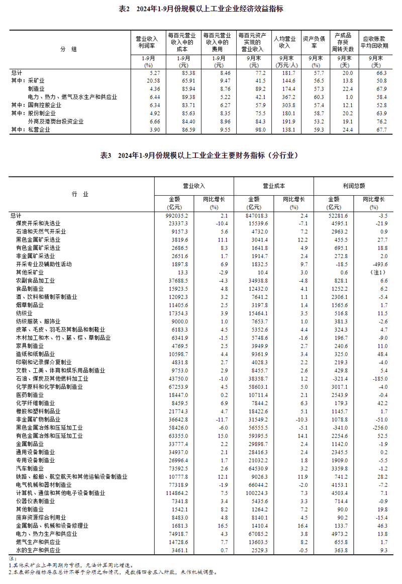 1—9月份,全國規(guī)模以上工業(yè)企業(yè)實現(xiàn)利潤總額52281.6億元,同比下降3.5%(按可比口徑計算,詳見附注二)。