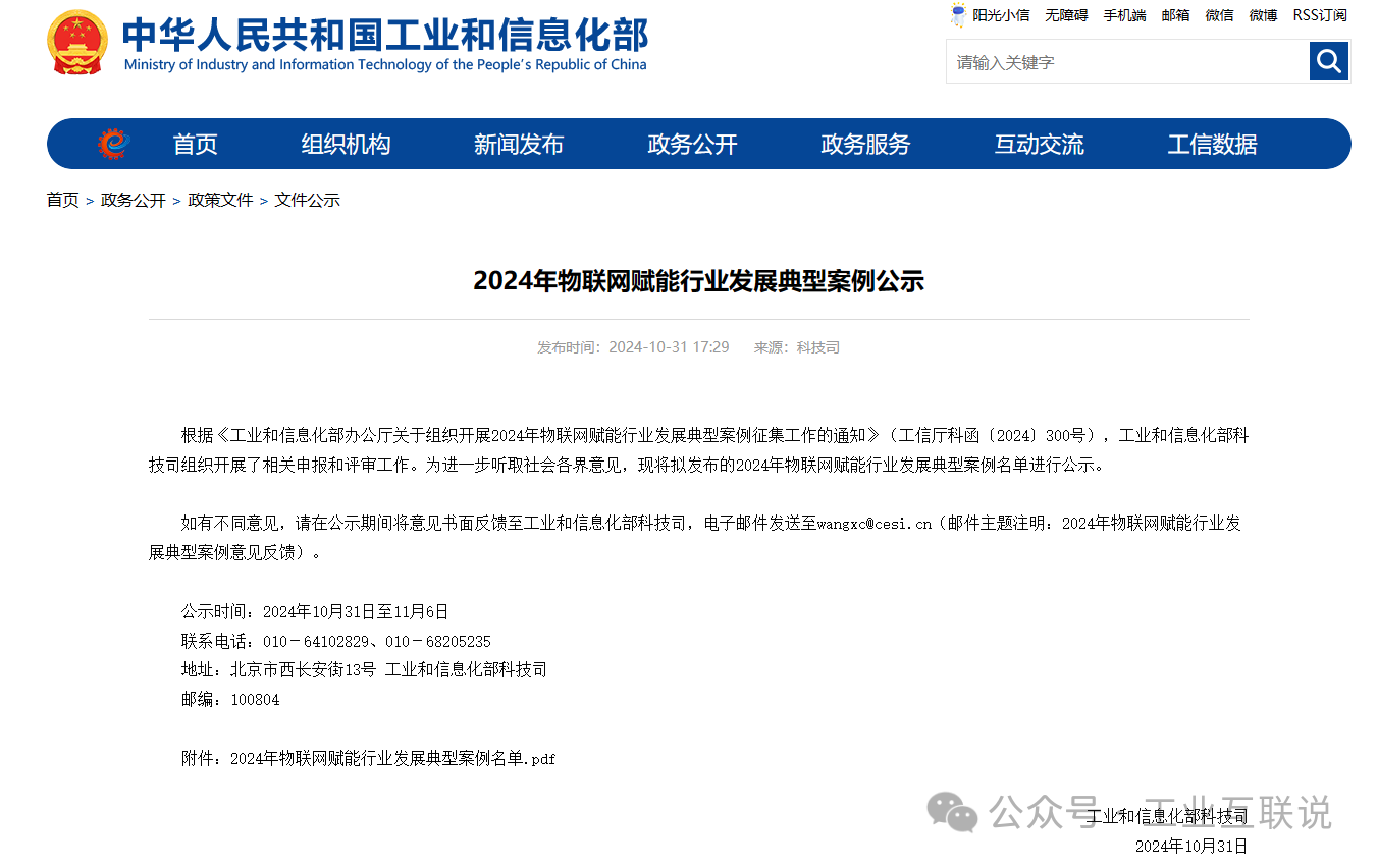 10月31日消息,工信部官方發(fā)布2024年物聯(lián)網賦能行業(yè)發(fā)展典型案例公示。
