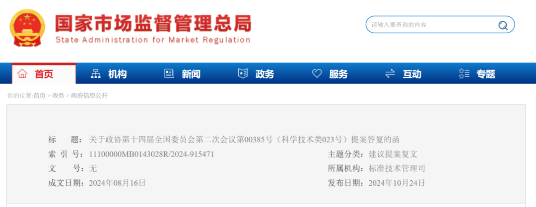 日前,市場(chǎng)監(jiān)管總局在《關(guān)于政協(xié)第十四屆全國(guó)委員會(huì)第二次會(huì)議第00385號(hào)(科學(xué)技術(shù)類023號(hào))提案答復(fù)的函》中表示,市場(chǎng)監(jiān)管總局(國(guó)家標(biāo)準(zhǔn)委)高度重視標(biāo)準(zhǔn)化支撐高質(zhì)量發(fā)展的基礎(chǔ)性引領(lǐng)性作用,正加快推動(dòng)相關(guān)工作。具體內(nèi)容如下: