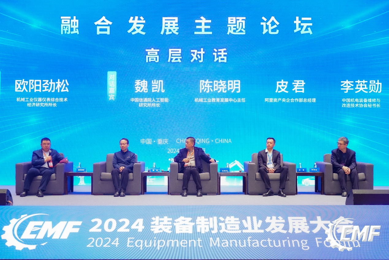 高層對話環節將論壇推向了高潮。中國信通院人工智能研究所所長魏凱、機械工業教育發展中心主任陳曉明、阿里資產央企合作部總經理皮君以及中國機電裝備維修與改造技術協會秘書長李英勛等行業領袖圍繞推動裝備制造業與新技術融合發展、深化產教融合與校企合作、數字化平臺助力供應鏈安全高效發展以及推動裝備后市場產業發展等議題展開了深入交流和熱烈討論,為裝備制造業的未來發展提供了寶貴的思路和建議。