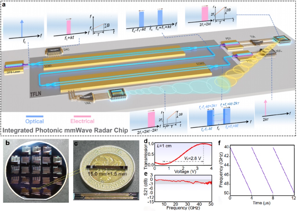 近日,中國科學院院士、南開大學智能光子研究院院長祝寧華團隊與香港城市大學合作,成功研制出薄膜鈮酸鋰光子毫米波雷達芯片,在毫米波雷達領域取得重大突破。這一創(chuàng)新成果,為未來6G通信、智能駕駛、精準感知等前沿領域的應用奠定了堅實基礎。