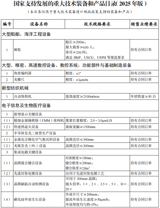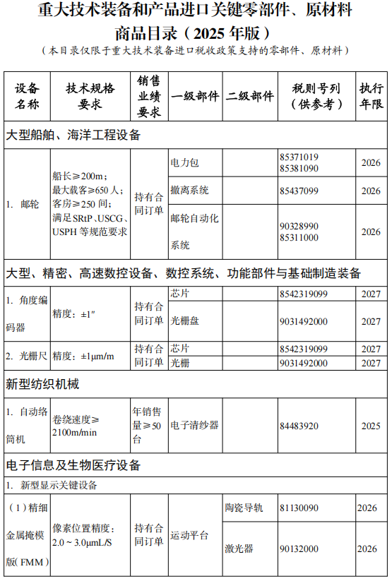 同步發(fā)布《國家支持發(fā)展的重大技術(shù)裝備和產(chǎn)品目錄(2025年版)》、《重大技術(shù)裝備和產(chǎn)品進口關(guān)鍵零部件、原材料商品目錄(2025年版)》和《進口不予免稅的重大技術(shù)裝備和產(chǎn)品目錄(2025年版)》,自2025年3月1日起執(zhí)行。