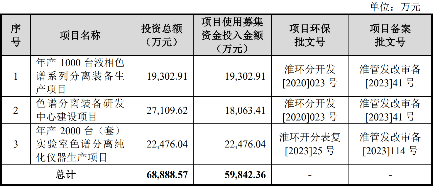 此次IPO擬募集5.98億元,用于年產(chǎn)1000臺液相色 譜系列分離裝備生產(chǎn)項目、色譜分離裝備研發(fā)中心建設(shè)項目、年產(chǎn)2000臺(套)實驗室色譜分離純化儀器生產(chǎn)項目。