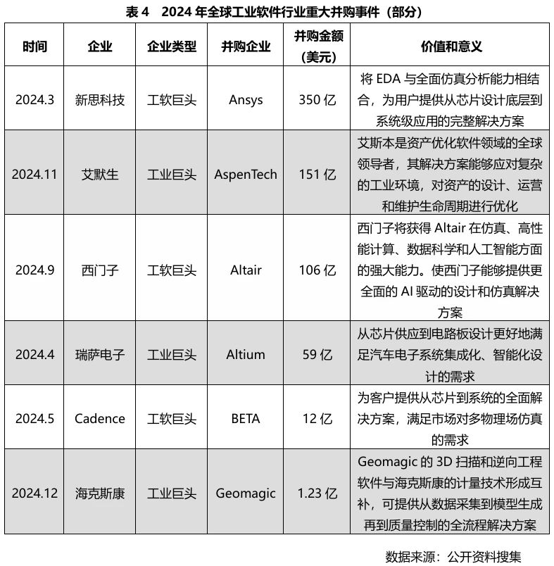 一方面,工業軟件巨頭之間進行并購整合,補全能力版圖;另一方面,工業巨頭也不斷并購工業軟件企業,強化自身軟件實力。