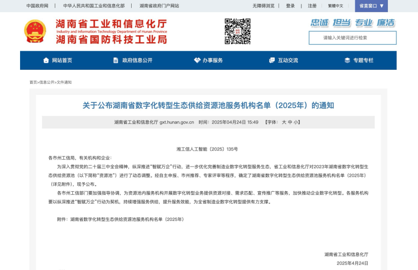 近日,湖南省工信廳發(fā)布了湖南省數(shù)字化轉(zhuǎn)型生態(tài)供給資源池服務(wù)機(jī)構(gòu)名單(2025年),威勝信息成功入選湖南省制造業(yè)數(shù)字化轉(zhuǎn)型生態(tài)供給資源池整體解決方案服務(wù)商。