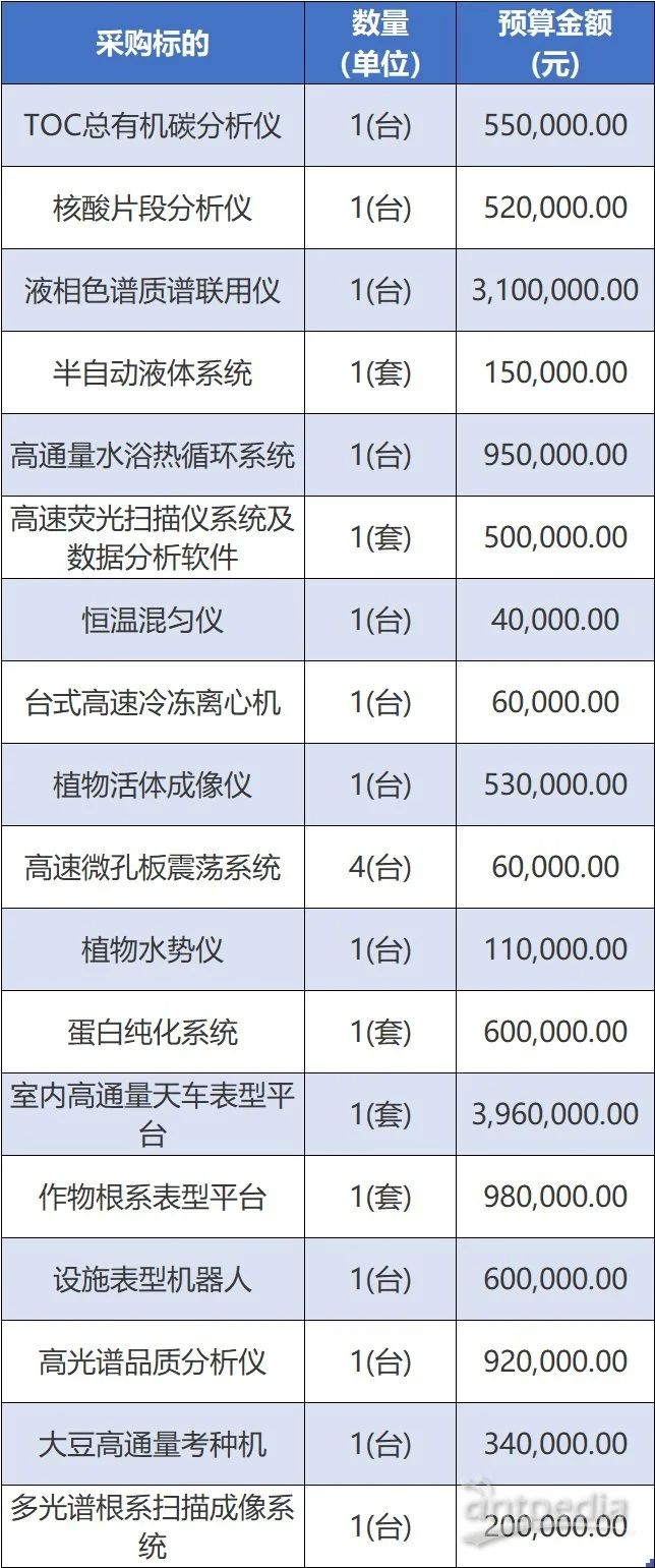 近日,黑龍江省農(nóng)業(yè)科學(xué)院發(fā)布了實(shí)驗(yàn)室儀器設(shè)備采購招標(biāo)公告,涵蓋了TOC總有機(jī)碳分析儀、核酸片段分析儀、液相色譜質(zhì)譜聯(lián)用儀、高通量水浴熱循環(huán)系統(tǒng)等21臺(套)儀器設(shè)備的采購,包件總預(yù)算為1417萬元。