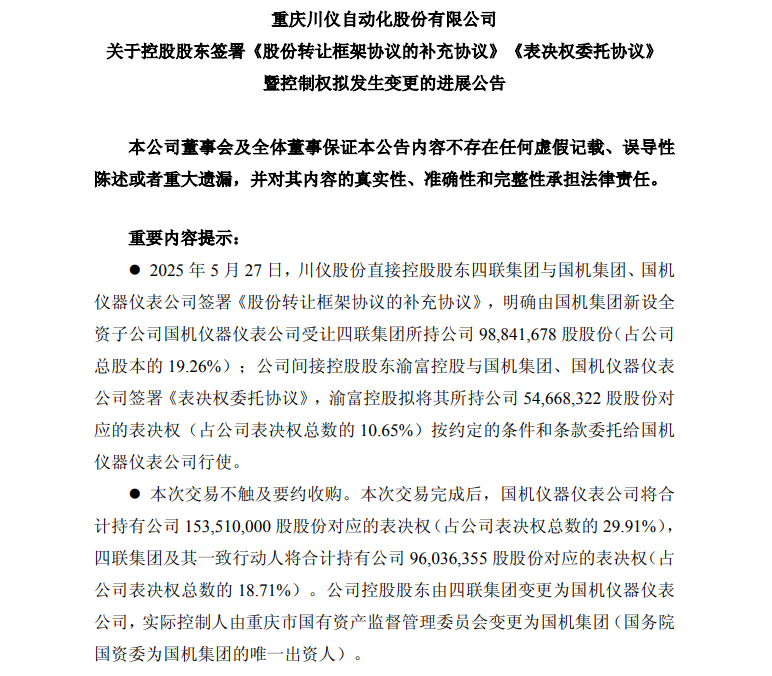 5月27日晚間,川儀股份(603100)公告,5月27日,公司直接控股股東四聯(lián)集團(tuán)與國(guó)機(jī)集團(tuán)、國(guó)機(jī)儀器儀表公司簽署《股份轉(zhuǎn)讓框架協(xié)議的補(bǔ)充協(xié)議》,明確由國(guó)機(jī)集團(tuán)新設(shè)全資子公司國(guó)機(jī)儀器儀表公司受讓四聯(lián)集團(tuán)所持公司98,841,678股股份(占公司總股本的19.26%);公司間接控股股東渝富控股與國(guó)機(jī)集團(tuán)、國(guó)機(jī)儀器儀表公司簽署《表決權(quán)委托協(xié)議》,渝富控股擬將其所持公司54,668,322股股份對(duì)應(yīng)的表決權(quán)(占公司表決權(quán)總數(shù)的10.65%)按約定的條件和條款委托給國(guó)機(jī)儀器儀表公司行使。