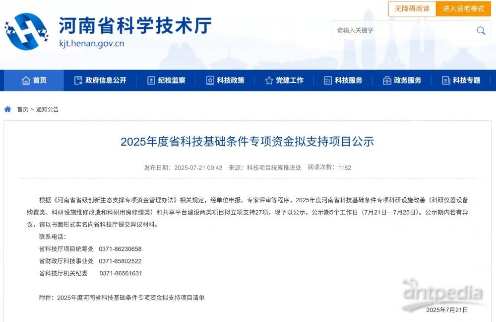 根據《河南省省級創新生態支撐專項資金管理辦法》相關規定,經單位申報、專家評審等程序,2025年度河南省科技基礎條件專項科研設施改善(科研儀器設備購置類、科研設施維修改造和科研用房修繕類)和共享平臺建設兩類項目擬立項支持27項,現予以公示,公示期5個工作日(721—725日)。公示期內若有異議,請以書面形式實名向省科技廳提交異議材料。