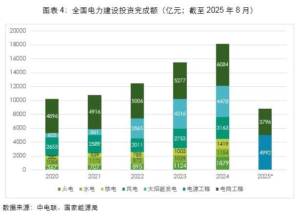 “十四五”我國(guó)電力建設(shè)投資保持快速增長(zhǎng),2020年突破1萬億元,2024年超1.8萬億元,2025年1-8月電源及電網(wǎng)投資同比均進(jìn)一步增長(zhǎng)。其中,火電投資增長(zhǎng)速度同樣迅猛,從2020年的567億元,到2023年的1124億元已接近翻倍,再到2024年的1879億元又有67%的大幅增長(zhǎng)。