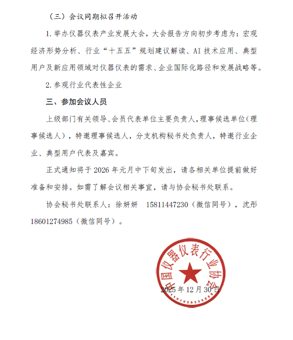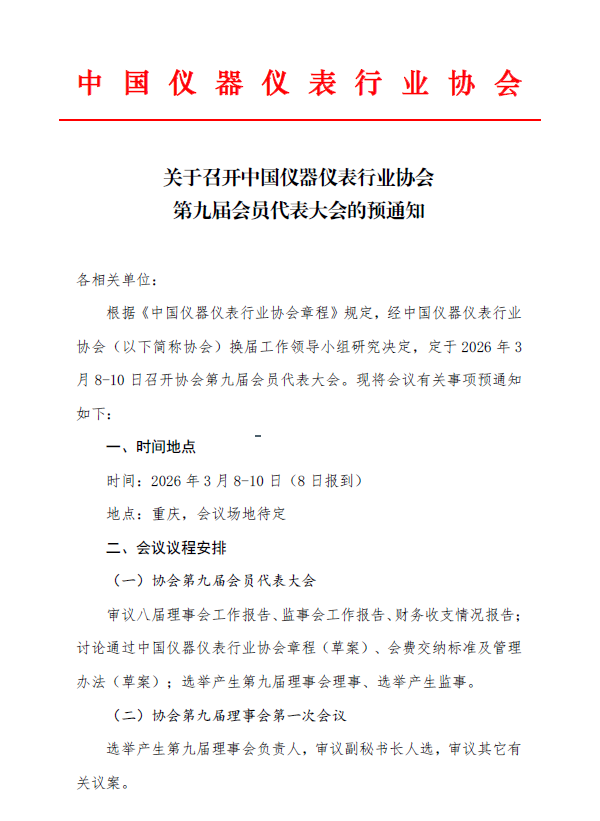 根據(jù)《中國(guó)儀器儀表行業(yè)協(xié)會(huì)章程》規(guī)定,經(jīng)中國(guó)儀器儀表行業(yè)協(xié)會(huì)(以下簡(jiǎn)稱(chēng)協(xié)會(huì))換屆工作領(lǐng)導(dǎo)小組研究決定,定于2026 38-10 日召開(kāi)協(xié)會(huì)第九屆會(huì)員代表大會(huì)。現(xiàn)將會(huì)議有關(guān)事項(xiàng)預(yù)通知如下: