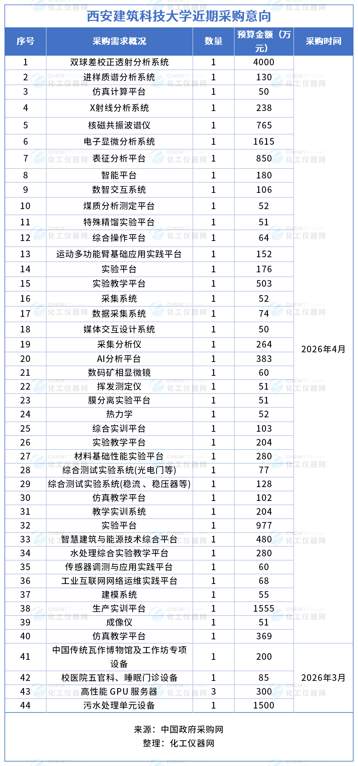 近期,西安建筑科技大學(xué)發(fā)布多項(xiàng)儀器采購意向,采購預(yù)算金額17047萬元,涉及儀器設(shè)備包括雙球差校正透射分析系統(tǒng)、進(jìn)樣質(zhì)譜分析系統(tǒng)、仿真計(jì)算平臺、X射線分析系統(tǒng)、核磁共振波譜儀、電子顯微分析系統(tǒng)等。預(yù)計(jì)采購時間2026年3月-4月。