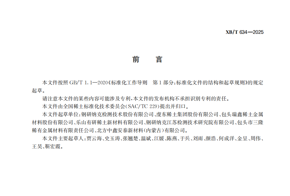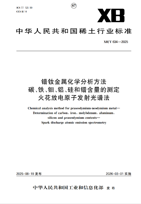 由鋼研納克檢測技術(shù)股份有限公司(以下簡稱“鋼研納克”)牽頭,鋼研納克江蘇檢測技術(shù)研究院有限公司參與,聯(lián)合多家行業(yè)重點(diǎn)稀土金屬生產(chǎn)企業(yè)共同起草的稀土行業(yè)標(biāo)準(zhǔn)《XB/T 634-2025 鐠釹金屬化學(xué)分析方法 碳、鐵、鉬、鋁、硅和鐠含量的測定 火花放電原子發(fā)射光譜法》已于2025年8月19日發(fā)布,于2026年3月1日起正式實(shí)施。作為稀土行業(yè)首個(gè)采用火花光譜分析方法的標(biāo)準(zhǔn),它進(jìn)一步完善了鐠釹金屬化學(xué)成分檢測方法體系,也體現(xiàn)了鋼研納克及鋼研納克江蘇檢測技術(shù)研究院有限公司在稀土檢測技術(shù)研發(fā)與標(biāo)準(zhǔn)化建設(shè)方面的持續(xù)積累。